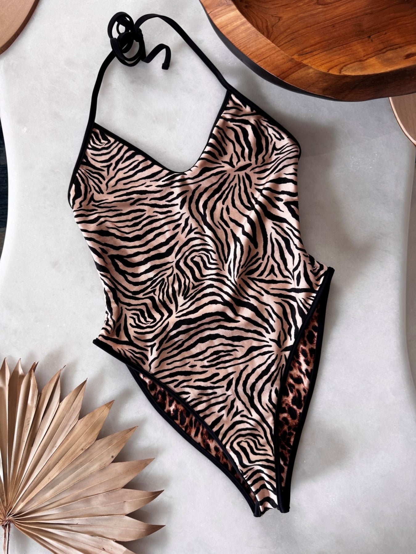 Daytona is the retro classic one piece. Universally flattering, this style features an open back and low plunge neckline with halter neck ties and a cheeky back for the perfect medium coverage. One side features the perfect leopard print while the other brings bold zebra stripes, perfect for switching up your vibe without packing extra.
