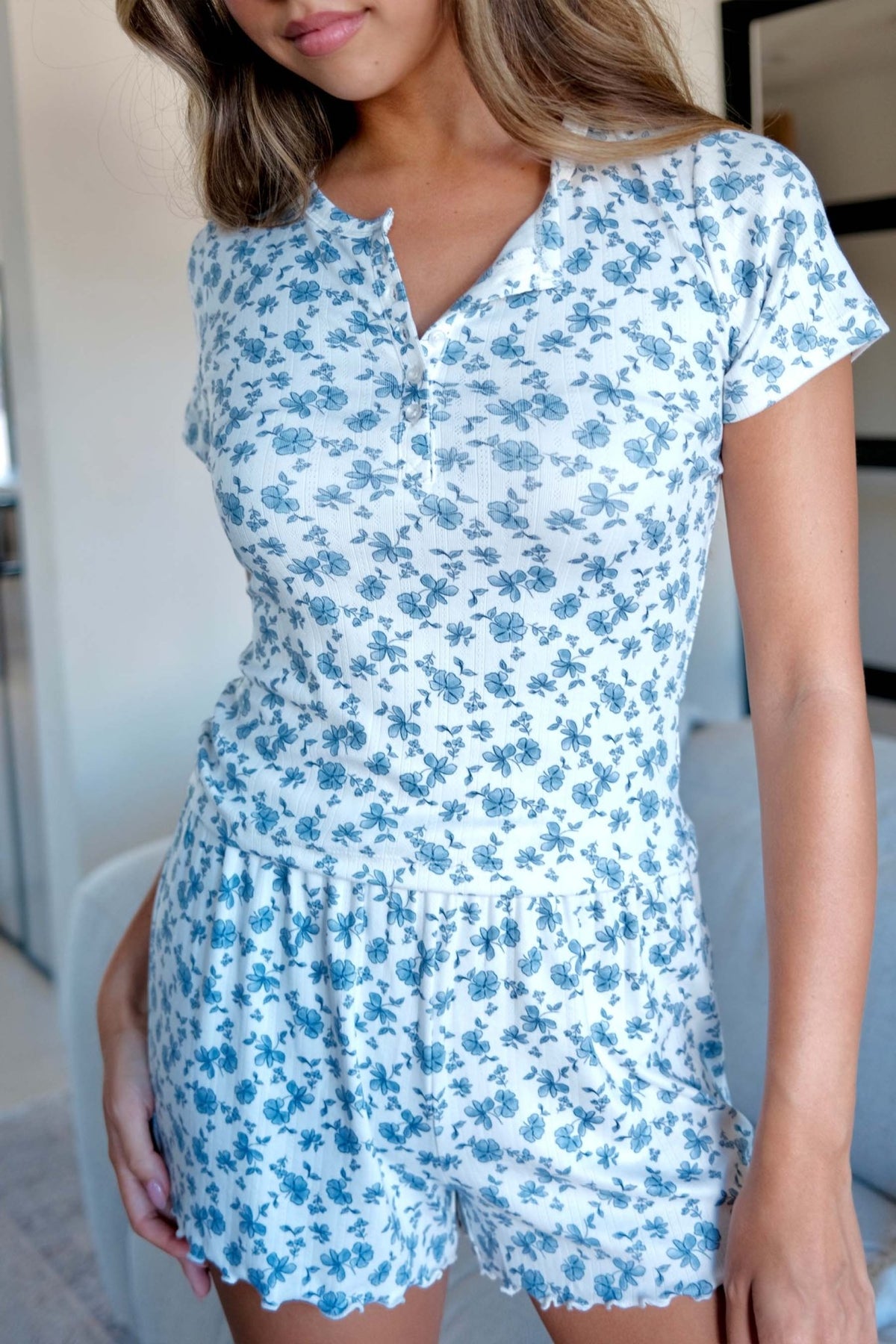 Our Ditsy Set is made for lounging, and soft enough for sleeping. This set includes a henley style top with a high waist short, made in a silky pointelle fabric with a sweet blue ditsy print. The relaxed fit and elastic waistband on the short make this matching set perfect for lounging!