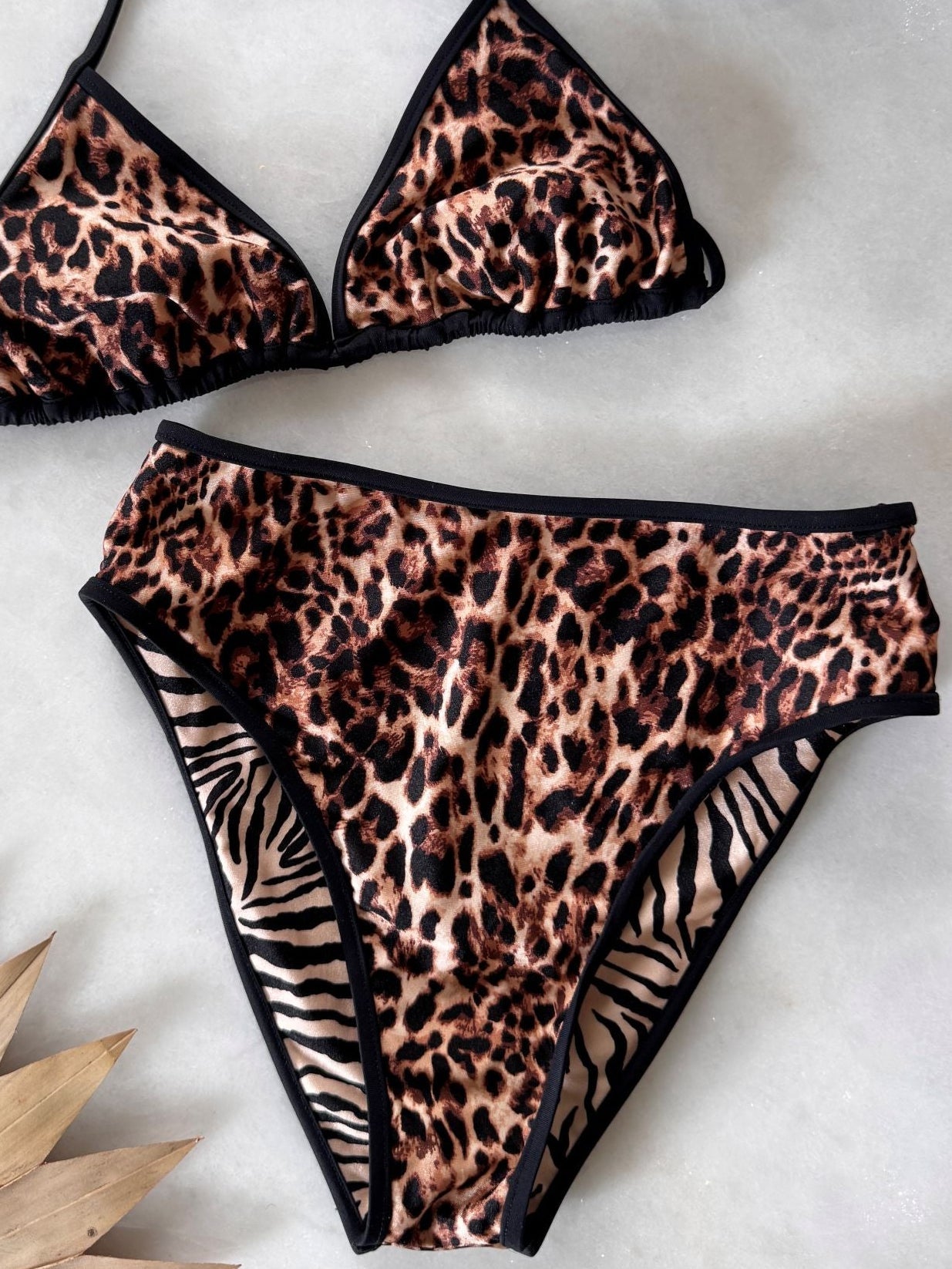 Monaco is our best-selling high-waisted bikini bottom with a high leg cut and cheeky coverage. One side serves up the perfect leopard print while the other gives bold zebra stripes, perfect for switching up your vibe without packing extra.