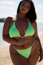 Reno bikini bottom is the perfect high leg, cheeky bottom with a scoop front and back. Wear it on the bright Blue or Green side with white contrast binding to mix & match with our reversible collection.
