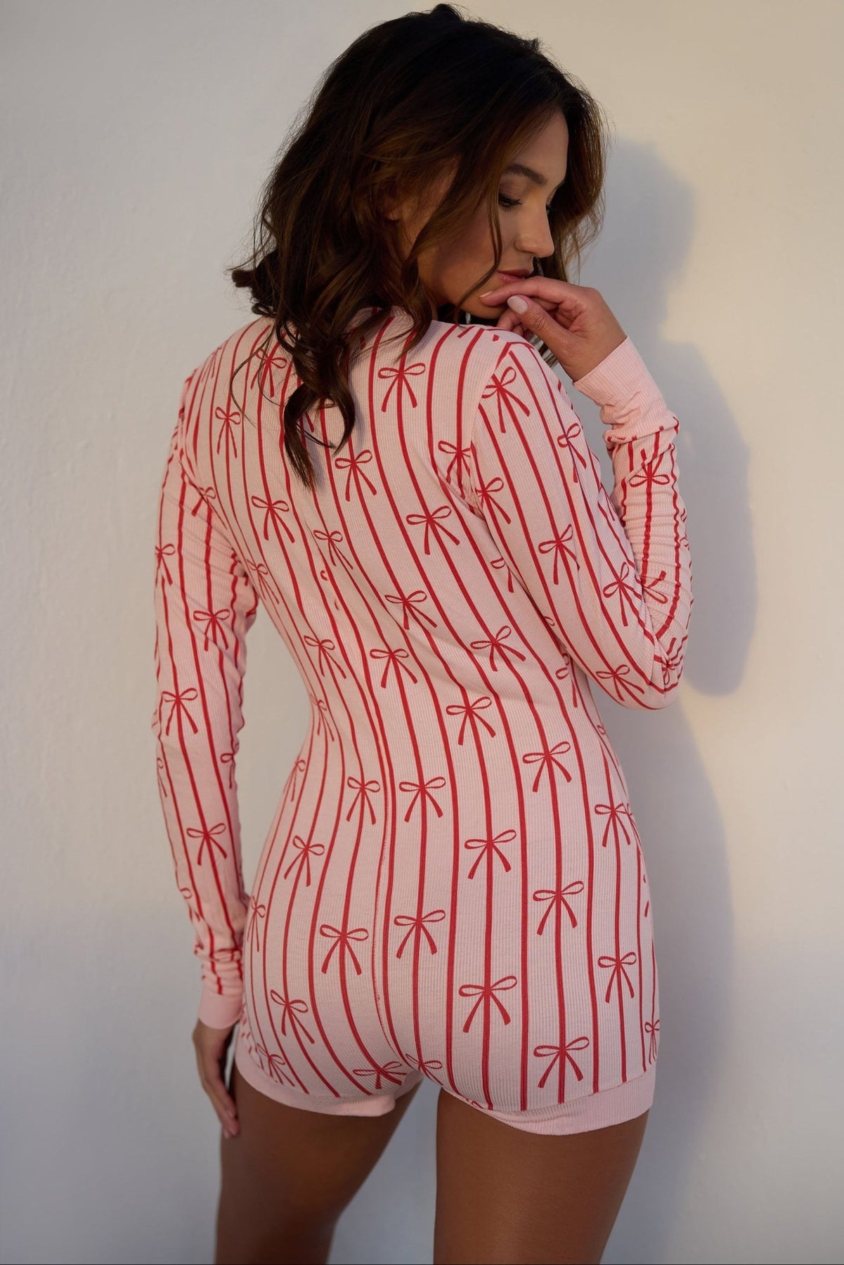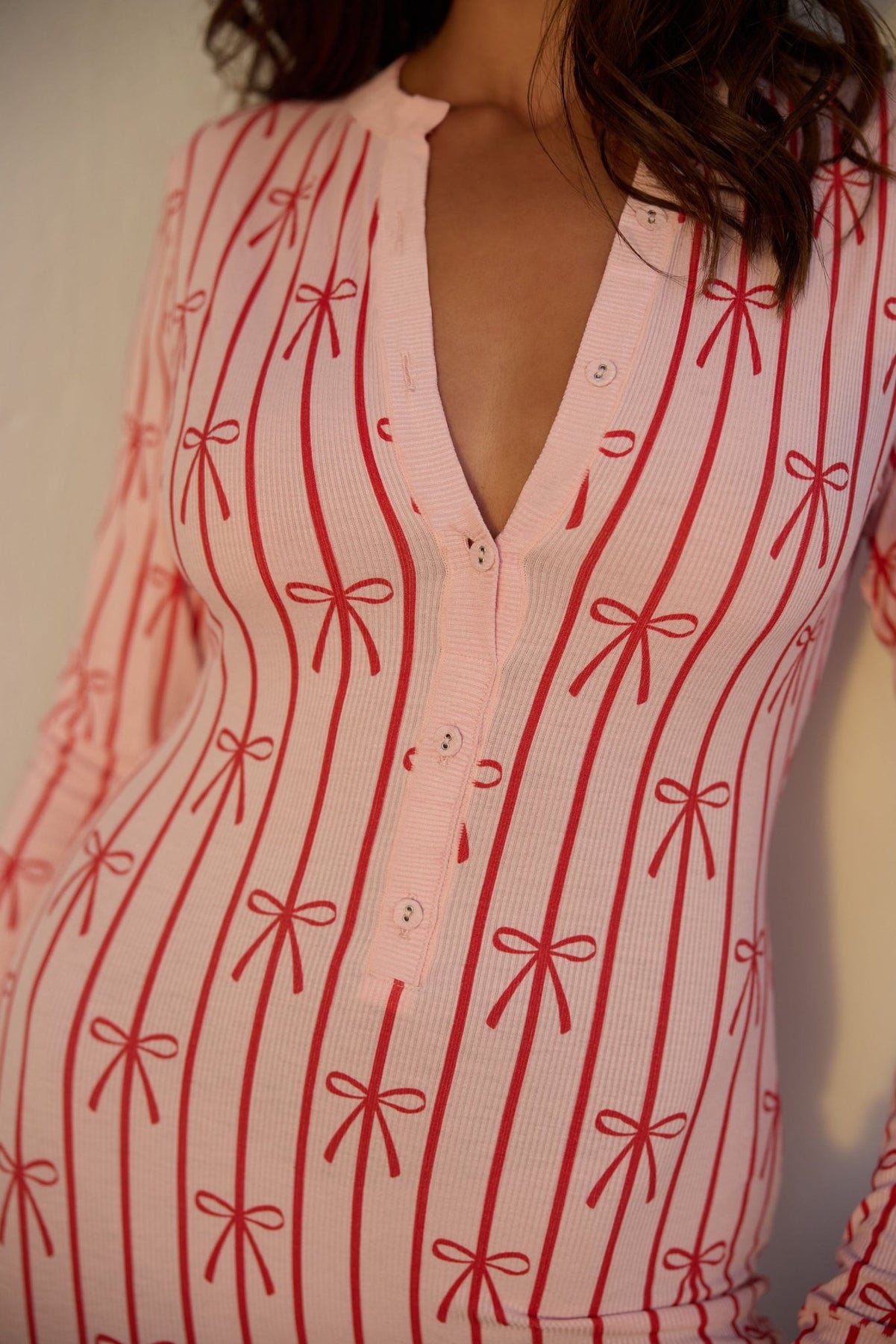 Your newest obsession is this Juno pajama romper, our favorite way to feel cute at home! This flirty red bow stripe print on a light pink ribbed fabric is so soft and comfy, you won't want to take it off. Juno is made to fit like a second skin, with buttons for adjusting your desired coverage level.